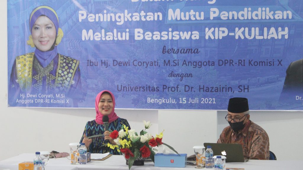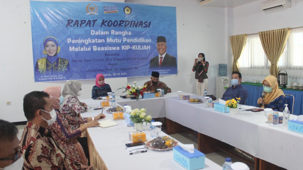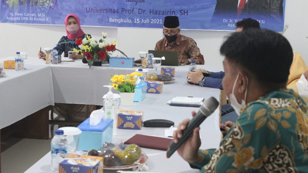 Komisi X Dewan Perwakilan Rakyat Republik Indonesia (DPR-RI) Hj. Dewi Coryati, M.Si melakukan rapat koordinasi Bersama civitas akademika di Universitas Prof. Dr. Hazairin, SH (UNIHAZ), Kamis (15/07/2021). Rapat koordinasi Hj. Dewi Coryati, M.Si dengan stakeholder pendidikan UNIHAZ dilakukan di Ruang MAP UNIHAZ.